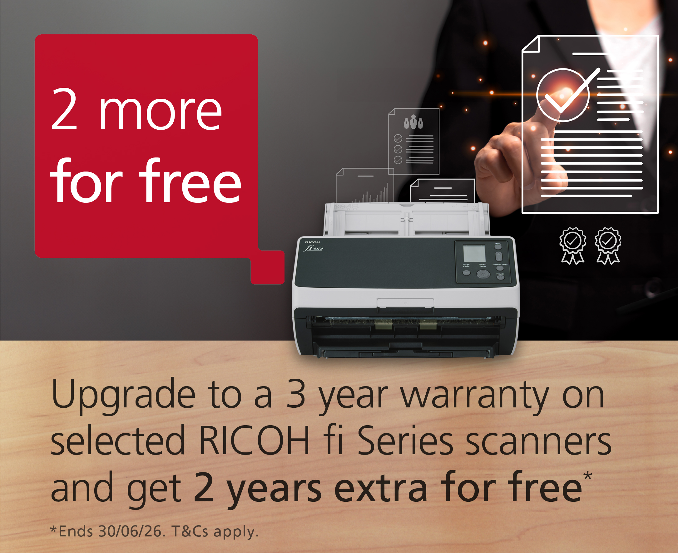 From now to 30th June 2026, you can get 2 more years of support for free with the purchase of a 3 Year Warranty* upon registration – increased from three to five years – on the RICOH fi‑8040, fi‑8150, fi‑8170, fi-8250 and fi‑8270 business scanners.