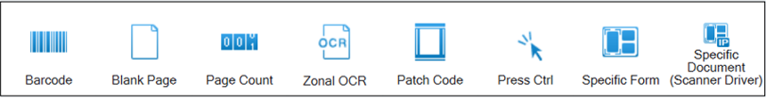 Documents Separation | Blank page (single /duplex) Page count Zonal OCR*3 Patch code Barcode (1D /2D) Press Ctrl Specific form Specific document (Scanner Driver) (Automatic Profile Selection) |