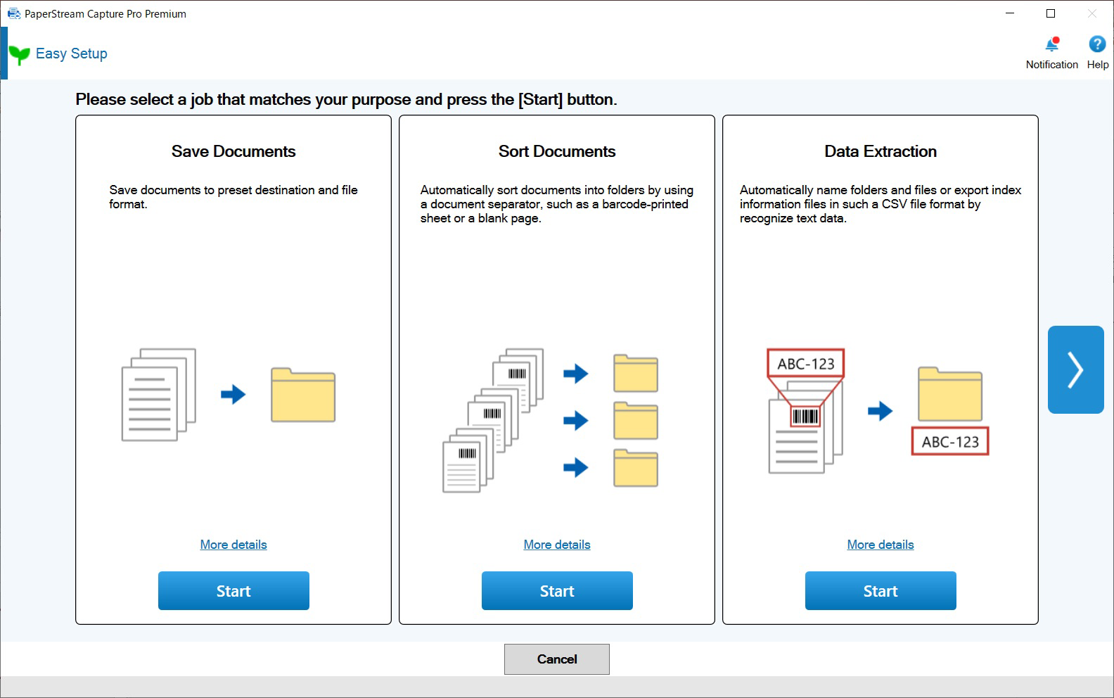 In the Easy Setup mode, operators have the choice of three options: Save Documents, Sort Documents, or Data Extraction. They can effortlessly create a job by selecting an option that suits their purpose and configure the settings according to the displayed instructions.