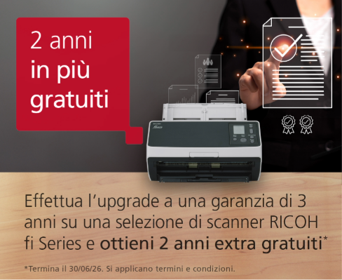 Da oggi fino al 30 giugno 2026, acquistando una garanzia di 3 anni* e registrando il prodotto, potrai ottenere 2 anni aggiuntivi di assistenza gratuita — passando da tre a cinque anni — sugli scanner professionali RICOH fi‑8040, fi‑8150, fi‑8170, fi‑8250 e fi‑8270.